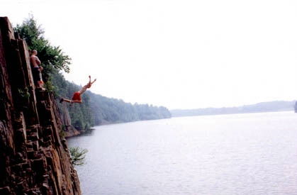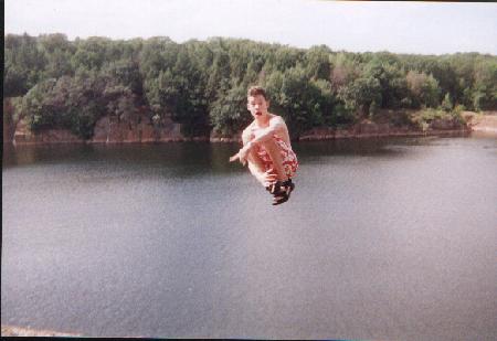 From Hartford, Take I-84 west turn onto Queen Street. Once you see "oak hill cemetary" (huge stone walls with pillars) turn onto that road. this is flanders street. you will follow this road, and pass by southington high school, and one stop sign. at the second stop sign, take a left (following the Rogers Orchards Sign). your next stop sign is going to be a three way intersection. take a right (still following the Rogers Orchards Sign). follow this road until you come to your next 3 way intersection. take a right (going the opposite way of the Rogers Orchards Sign). follow this road until you get to your next three way intersection. once again stay to the right. once on this road, you will eventually see a reservoire on your left, and then a huge grass hill/field. park your car on the next road on the right after this grass hill (Reservoire Ridge Road). Walk across the street and walk along the grass path and straight into the woods. go up the first big hill and at the top look for the blue markings on the trees or rocks. (dont go right where you have to cross over a tiny log tree in the beginning of the path) if you went the right way, you will have to step over this huge rotting log that lays paralel to the path. keep following the blue markings. once at the rock stairs, follow them up and at the top go forward and to the left a tiny bit. you will see the blue markings. follow the blue trail, it is very clearly marked with arrows and dots. keep your eye open for the markings. after about 15 minutes from the rock stairs, you will be at the first cliff. this one is called the RT. this is because a kid died off of this one. so i suggest that not too many people try this one…you have to clear trees and land and other scary stuff. there are random cliffs all along this path that you can jump off. the water is wicked deep so dont worry. if you follow further you can get to some low cliffs. theres an 18, 21, 25, 30, and some others in between and some higher right in that same area. if you jump you can follow the gravel type road, and after the bridge at the end, take a left into the woods. there are some cliffs on this side as well. low ones that are nice for flips and a 50 footer right next to it.